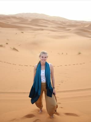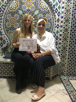 I realized I wanted to do something in a related field during the second half of my gap year. I ended up going to Marrakech, Morocco for five months and interned at a nonprofit. My homestay was in an impoverished area in Marrakech on the outskirts of town. There were seven of us living in a two-bedroom house. I showered at the local hammam [bath house] with everybody in the neighborhood. As a 5-foot-9 blonde nineteen-year-old, needless to say, I stuck out. I started learning Arabic while in Morocco so that I could begin to understand what was happening around me. My host family didn't speak any English, but my host mother in particular loved me and took care of me.