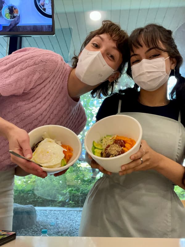 "This photo was taken at the CLS Korean, Busan site with my CLS peer Camryn Hay and I showing off our Bibimbap dishes during our CLS cooking class. Bibimbap is a traditional Korean dish and is a staple in Korean cuisine. This was a very fun experience of cooking while interacting in our target language, with the reward of getting to enjoying our delicious dishes at the end."—Rana Yelen