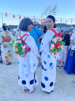 "This was taken with new friend, Tsukasa Fukuda, right before our second performance of bon odori. Through an initial introduction to local folk dance through a CLS excursion at Kyoyama Community Center, I attended festival dance rehearsals and made wonderful lifelong friends who gave me the incredible honor of including me in their traditional performance, dancing alongside them in full costume, as seen here. Tsukasas mother is a kimono master whom I met at these events. She had gifted me kimono items and dressed me in beautiful formal kimono for the CLS closing ceremony. I am still in contact with the community long after, including the festival organizer, Takeshi Ihira. This experience changed the trajectory of my PhD research on dance, and I am now writing these wonderful memories into my dissertation!"