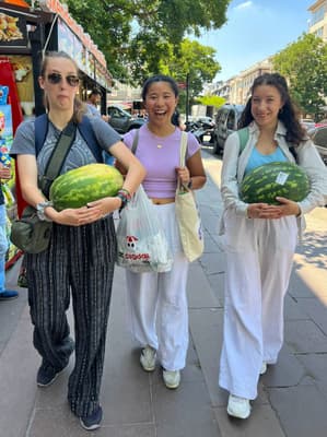 "To celebrate the 4th of July, our cohort threw a party and invited our language partners to celebrate Independence Day together. Emma, Elizabeth, and I bought watermelons, a staple food of the 4th of July, and carried them from the grocery store to campus for the party."
